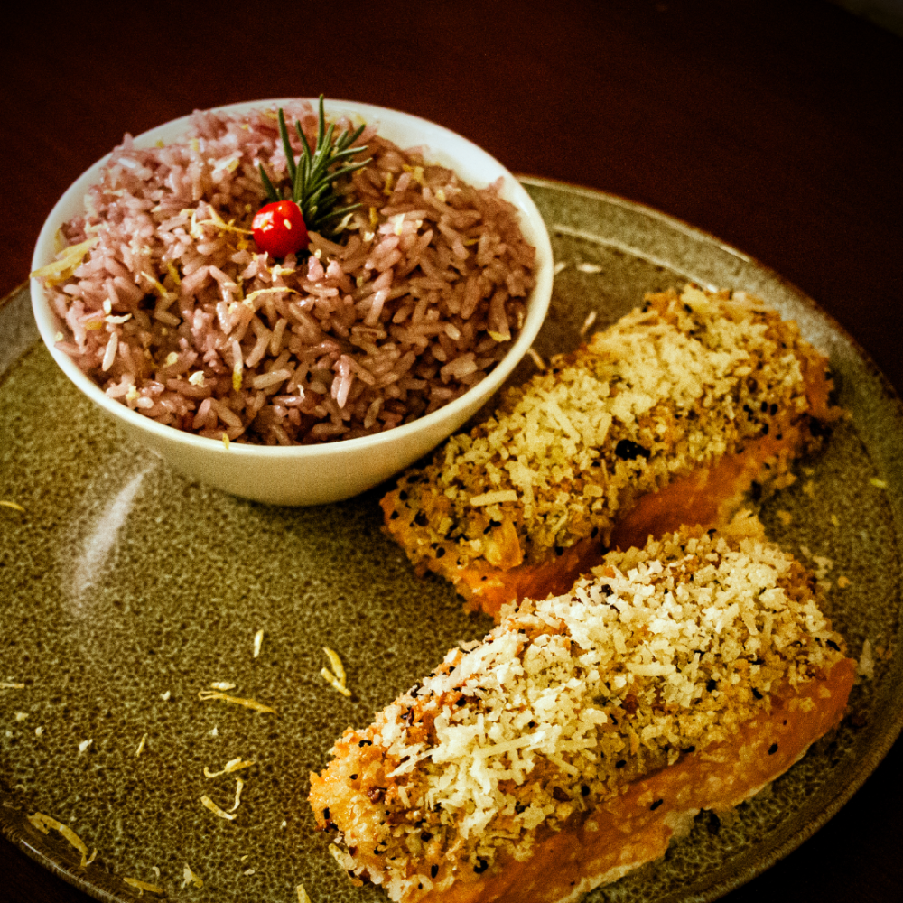 Salmão grelhado, coberto com mix de castanhas, farinha panko e queijo parmesão, servido com arroz cremoso, raspas de limão siciliano e um toque de vinho tinto - Serve duas pessoas