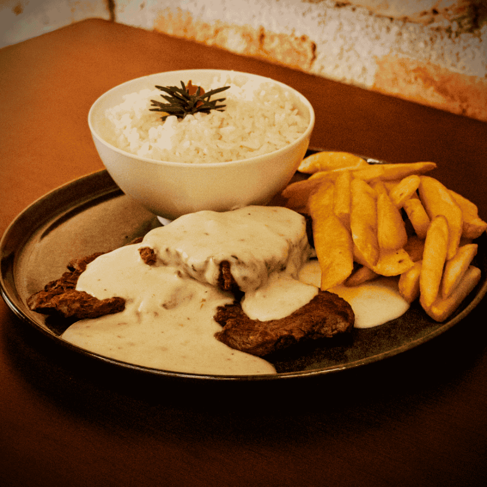 Filé mignon grelhado, coberto com molho quatro queijos, servido com arroz branco e batata frita - Serve duas pessoas